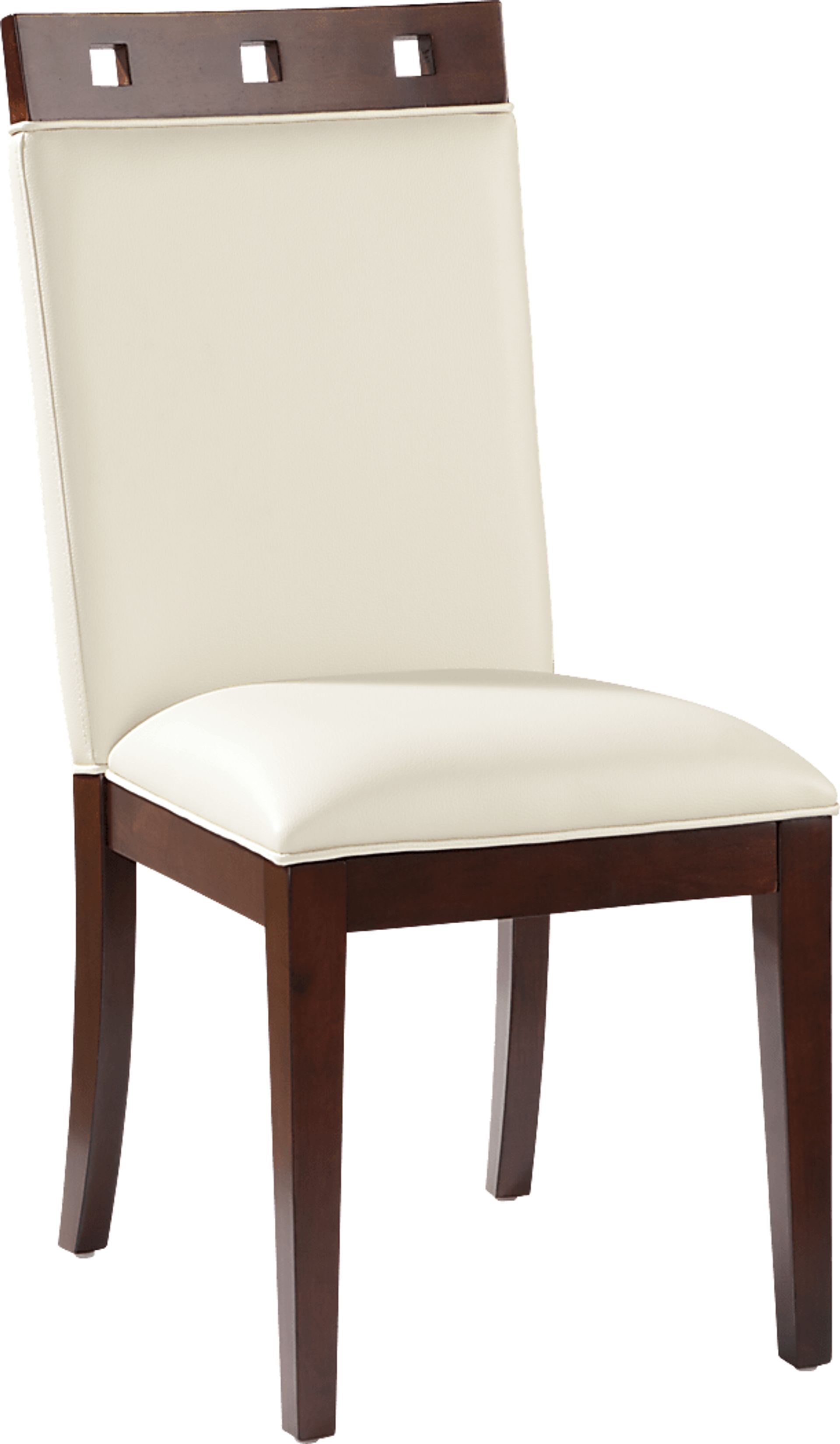 Modern design at its finest. The Savona wood top side chair's contemporary approach to comfort allows you to have your cake and eat it too. Upholstered in supple and easy-to-clean UltraHyde fabric in a sophisticated ivory color, this sleek chair is nicely balanced by a cherry finished base and top rail featuring three chic cutouts. Plush and stylish, what's not to like?
