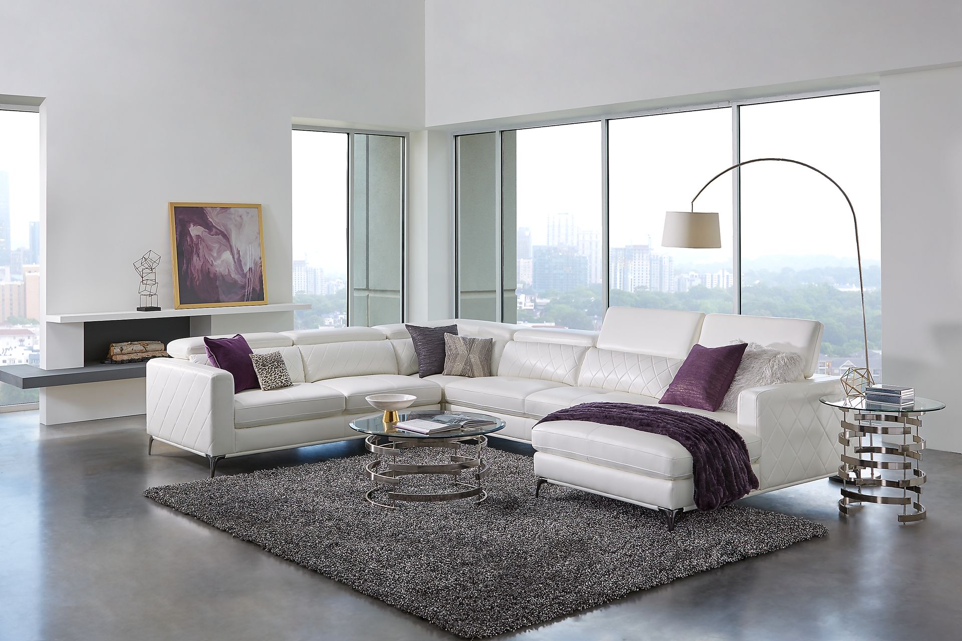 Modern elegance with a contemporary twist, the Via Sorrento sectional offers indulgent comfort with a side of quality. Upholstered in soft white fabric, this sectional is far from ordinary thanks to special touches such as quilted back cushions, ratchet style headrests, contrasting stitching and sleek chrome finished legs. Seating up to six adults, this luxurious sectional takes center stage in any living space. Upholstery: 85% Polyester, 15% Polyurethane