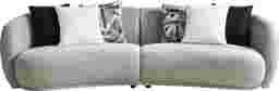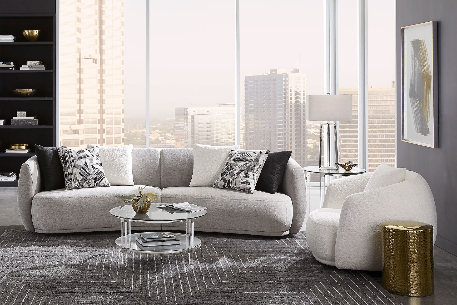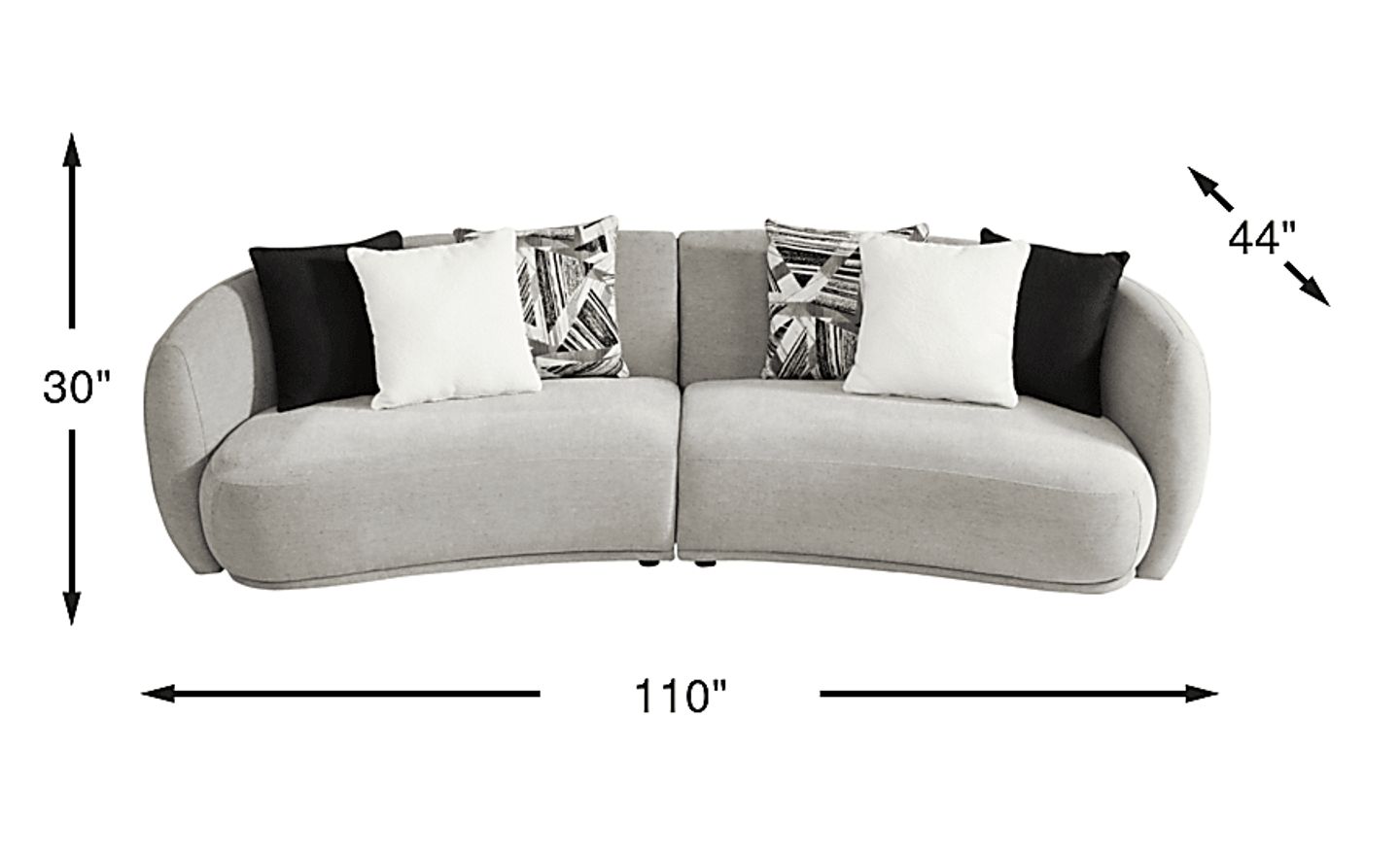 Modern in design, Soho Heights adds a minimalistic yet eye-catching touch to any space. Fashioned with an ultra-low profile, this sectional pairs casual comfort with modish appeal. Large seat and back cushions provide spacious seating while the curved silhouette and arched tuxedo arms add futuristic flair. Black, gray and ivory accent pillows add contrast again the platinum gray knitted fabric. Upholstery: 100% Polyester.
