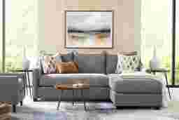 Casual grace with a sly glint of fashion-forward style in the Soho Place sofa from Cindy Crawford Home are the keys to a trendy living room that adds an easy groove to an uptown zip. Upholstered in soft gray chenille, this seat features chic sloped track arms and reversible scatter back pillows. The seat cushions are also reversible, perfect when it's time to move the floating chaise over for a fresh room arrangement. Welted seams on the arms and back pillows give the impression of a frame, heightening the contemporary look. Upholstery: 95% Polyester, 5% Linen.