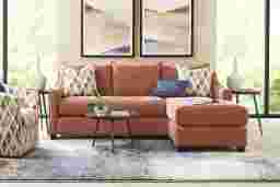 Casual grace with a sly glint of fashion-forward style in the Soho Place collection from Cindy Crawford Home are the keys to a trendy living room that adds an easy groove to an uptown zip. Upholstered in soft russet chenille, the sofa features chic sloped track arms and reversible scatter back pillows. The seat cushions are also reversible, perfect when it's time to move the floating chaise over for a fresh room arrangement. Welted seams on the arms and back pillows give the impression of a frame, heightening the contemporary look. Nestled away for overnight guests, a Sealy Royale mattress pulls out to provide a comfortable place for rest. Upholstery: 95% Polyester 5% Linen.