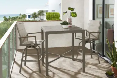 Make the most of your outdoor living space with the Solana bar height dining set. Each piece is made with rust-resistant sturdy aluminum in a high gloss taupe finish. The 38 inch square balcony table features a streamlined look thanks to a breezy slat-topped surface. An umbrella hole in the center of the table can be capped when not in use. Each swivel barstool is enhanced with teak wood accents on the arms while padded vinyl cushions with Dacron padding add durable comfort.