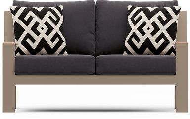 The Solana sofa embraces contemporary lines and an open, breezy slat back to make lounging on your patio an absolute treat. Made with a rust-resistant aluminum frame in a powder coated taupe finish with teak accents on both arms, each charcoal-colored cushion is solution dyed for durable outdoor use. Accent pillows in complementing tones are included, adding a subtle pop of color and texture that aids in your relaxation. High performance acrylic fabric. Select cushion colors also available in Sunbrella fabric.