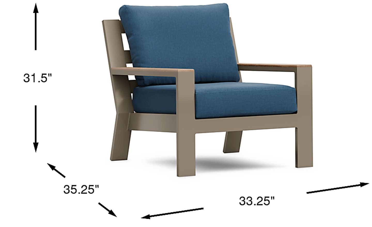 The Solana club chair has a casual look with clean, contemporary lines. Made with a rust-resistant aluminum frame in a powder coated taupe finish, teak accents on each arm add a hint of tropical flair. Upholstered in a durable blueberry-colored solution dyed fabric for outdoor use, the open slat back creates a breezy look suitable for any outdoor space. Select cushion colors also available in Sunbrella fabric.