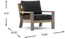 The Solana club chair has a casual look with clean, contemporary lines. Made with a rust-resistant aluminum frame in a powder coated taupe finish, teak accents on each arm add a hint of tropical flair. Upholstered in a durable charcoal-colored solution dyed fabric for outdoor use, the open slat back creates a breezy look suitable for any outdoor space. Select cushion colors also available in Sunbrella fabric.