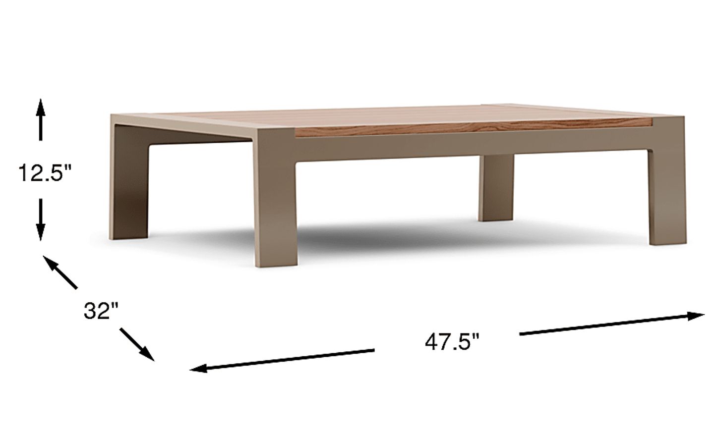 The Solana cocktail table creates the perfect centerpiece for casual outdoor entertaining and relaxing. Made with a sturdy rust-resistant aluminum frame in a high gloss taupe finish, it's topped with a chic slat teak surface that is the ideal place for books, appetizers, cocktails, or coffee.