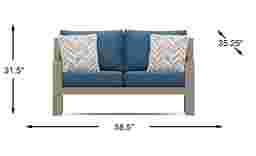 A stylish seat for two, the Solana loveseat is an attractive option for outdoor relaxation. The sturdy powder coated taupe aluminum frame features a slat back that embraces contemporary style with a breezy aesthetic. Each upholstered blueberry-colored cushion cradles you in comfort and is solution dyed for durability, looking great in your backyard season after season. Teak accents on each arm lend subtle tropical flair, while each included accent pillow adds to your comfort. Select cushion colors also available in Sunbrella fabric.