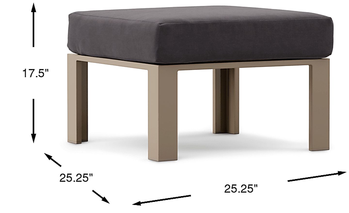 An ideal companion to its matching chair, the Solana ottoman provides a comfy, padded spot to prop up your feet. Topped with a charcoal-colored cushion upholstered in a durable solution dyed fabric, the sturdy powder coated taupe aluminum frame has clean lines. High performance acrylic fabric. Select cushion colors also available in Sunbrella fabric.