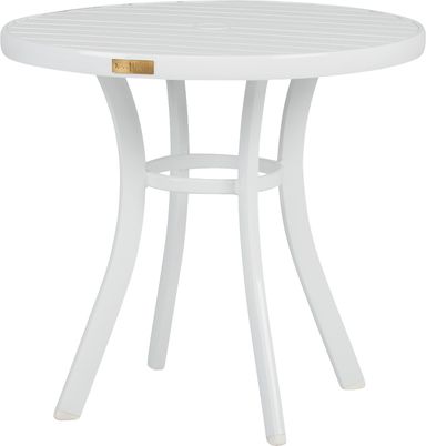 Meals taste better and drinks are even more relaxing when enjoyed outside, so consider the Solana 38 inch square bar height dining table for your outdoor needs. A sturdy aluminum frame in a high gloss white finish has a streamlined look with a casual feel thanks to the breezy slat-topped surface. It wipes clean with mild soap and water. An umbrella hole in the center of the table can be capped when not in use.