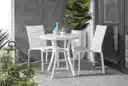 Refreshments taste even better when enjoyed outside, so consider the Solana 32 inch round dining table for your outdoor needs. It boasts a sturdy aluminum frame in a high gloss white finish along with a slat-topped surface that wipes clean with mild soap and water. An umbrella hole in the center of the table can be capped when not in use.