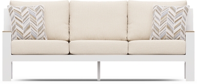 A stylish seat for two, the Solana loveseat is an attractive option for outdoor relaxation. The sturdy powder coated white aluminum frame features a slat back that embraces contemporary style with a breezy aesthetic. Each upholstered bisque-colored cushion cradles you in comfort and is solution dyed for durability, looking great in your backyard season after season. Teak accents on each arm lend subtle tropical flair, while each included accent pillow adds to your comfort. Select cushion colors also available in Sunbrella fabric.