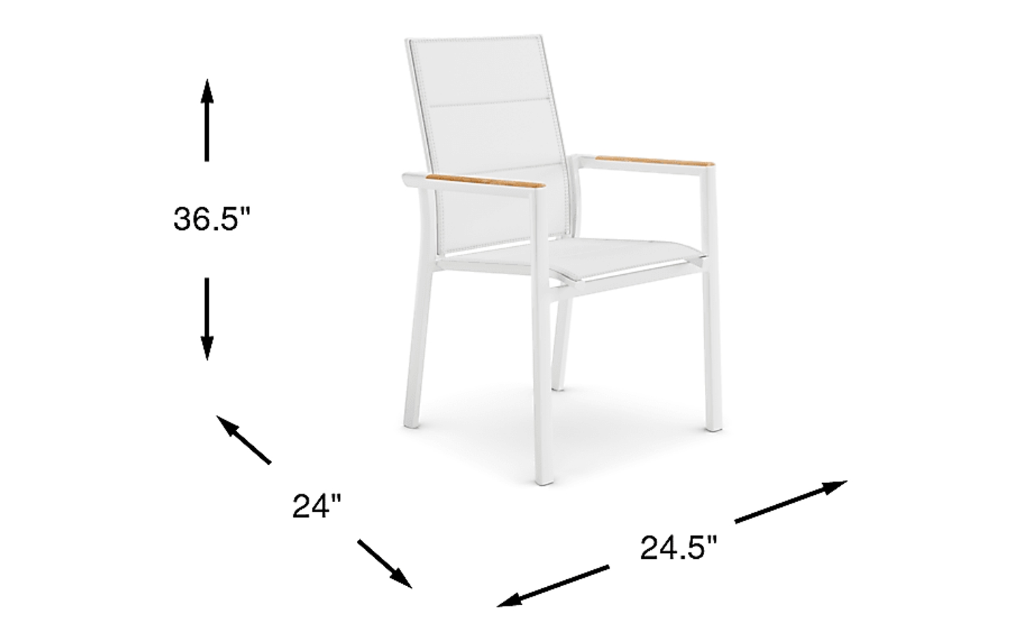 The Solana arm chair offers a timeless look suitable for any outdoor space. Made with a rust-resistant sturdy aluminum frame in a powder coated white finish, the padded vinyl seat features Dacron padding for streamlined comfort. Easily spot cleaned with mild soap and water, the lightweight and stackable frame gives it an ease of mobility that makes re-decorating a snap. Each arm features teak wood accents.