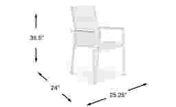 The Solana arm chair offers a timeless look suitable for any outdoor space. Made with a rust-resistant sturdy aluminum frame in a powder coated white finish, the padded vinyl seat features Dacron padding for streamlined comfort. Easily spot cleaned with mild soap and water, the lightweight and stackable frame gives it an ease of mobility that makes re-decorating a snap. Each arm features teak wood accents.