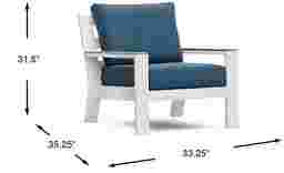 The Solana club chair has a casual look with clean, contemporary lines. Made with a rust-resistant aluminum frame in a powder coated white finish, teak accents on each arm add a hint of tropical flair. Upholstered in a durable blueberry-colored solution dyed fabric for outdoor use, the open slat back creates a breezy look suitable for any outdoor space. Select cushion colors also available in Sunbrella fabric.