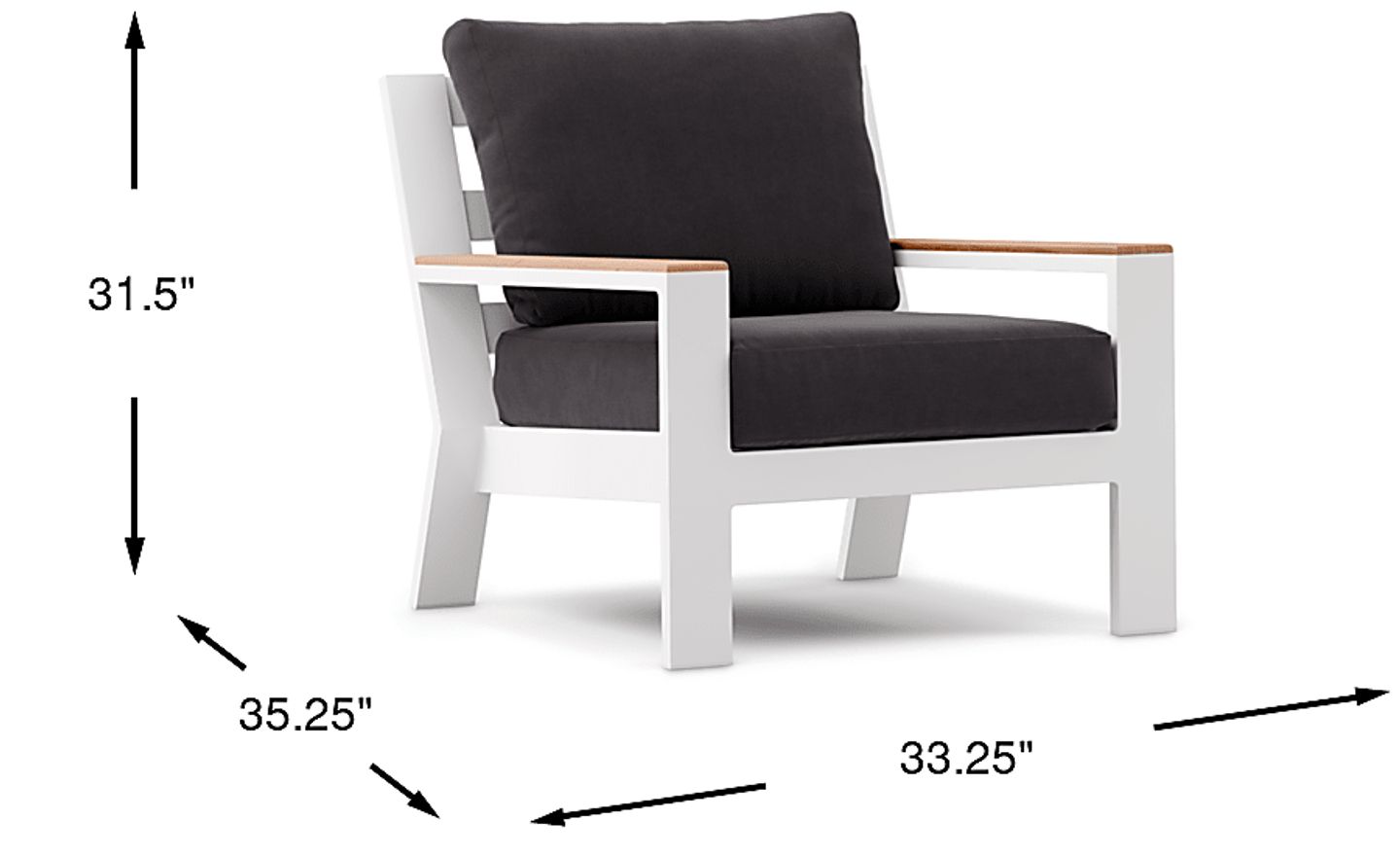 The Solana club chair has a casual look with clean, contemporary lines. Made with a rust-resistant aluminum frame in a powder coated white finish, teak accents on each arm add a hint of tropical flair. Upholstered in a durable charcoal-colored solution dyed fabric for outdoor use, the open slat back creates a breezy look suitable for any outdoor space. Select cushion colors also available in Sunbrella fabric.
