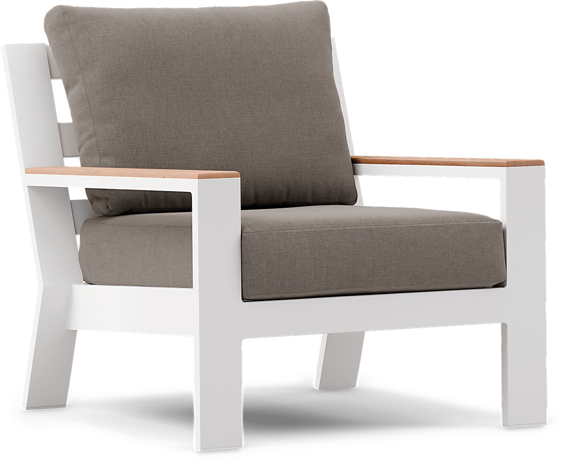 The Solana club chair has a casual look with clean, contemporary lines. Made with a rust-resistant aluminum frame in a powder coated white finish, teak accents on each arm add a hint of tropical flair. Upholstered in durable mushroom-colored solution dyed 100% Sunbrella fabric for outdoor use, the open slat back creates a breezy look suitable for any outdoor space. To clean Sunbrella fabric cushions remove dirt and spray on cleaning solution (water and mild soap), then use a soft bristle brush or sponge. Allow cleaning solution to soak into fabric and rinse thoroughly until soap residue is removed. Air dry. Do not dry clean.
