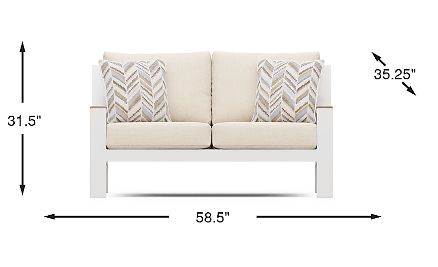 A stylish seat for two, the Solana loveseat is an attractive option for outdoor relaxation. The sturdy powder coated white aluminum frame features a slat back that embraces contemporary style with a breezy aesthetic. Each upholstered bisque-colored cushion cradles you in comfort and is solution dyed for durability, looking great in your backyard season after season. Teak accents on each arm lend subtle tropical flair, while each included accent pillow adds to your comfort. Select cushion colors also available in Sunbrella fabric.