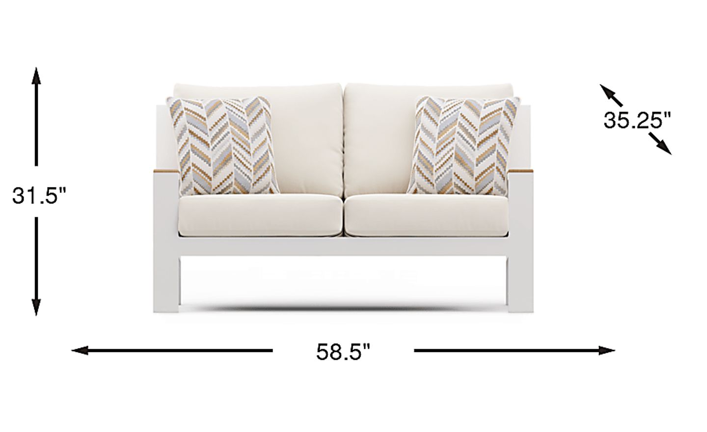 A stylish seat for two, the Solana loveseat is an attractive option for outdoor relaxation. The sturdy powder coated white aluminum frame features a slat back that embraces contemporary style with a breezy aesthetic. Each upholstered natural-colored cushion cradles you in comfort and is solution dyed for durability, looking great in your backyard season after season. Teak accents on each arm lend subtle tropical flair, while each included accent pillow adds to your comfort. Select cushion colors also available in Sunbrella fabric.