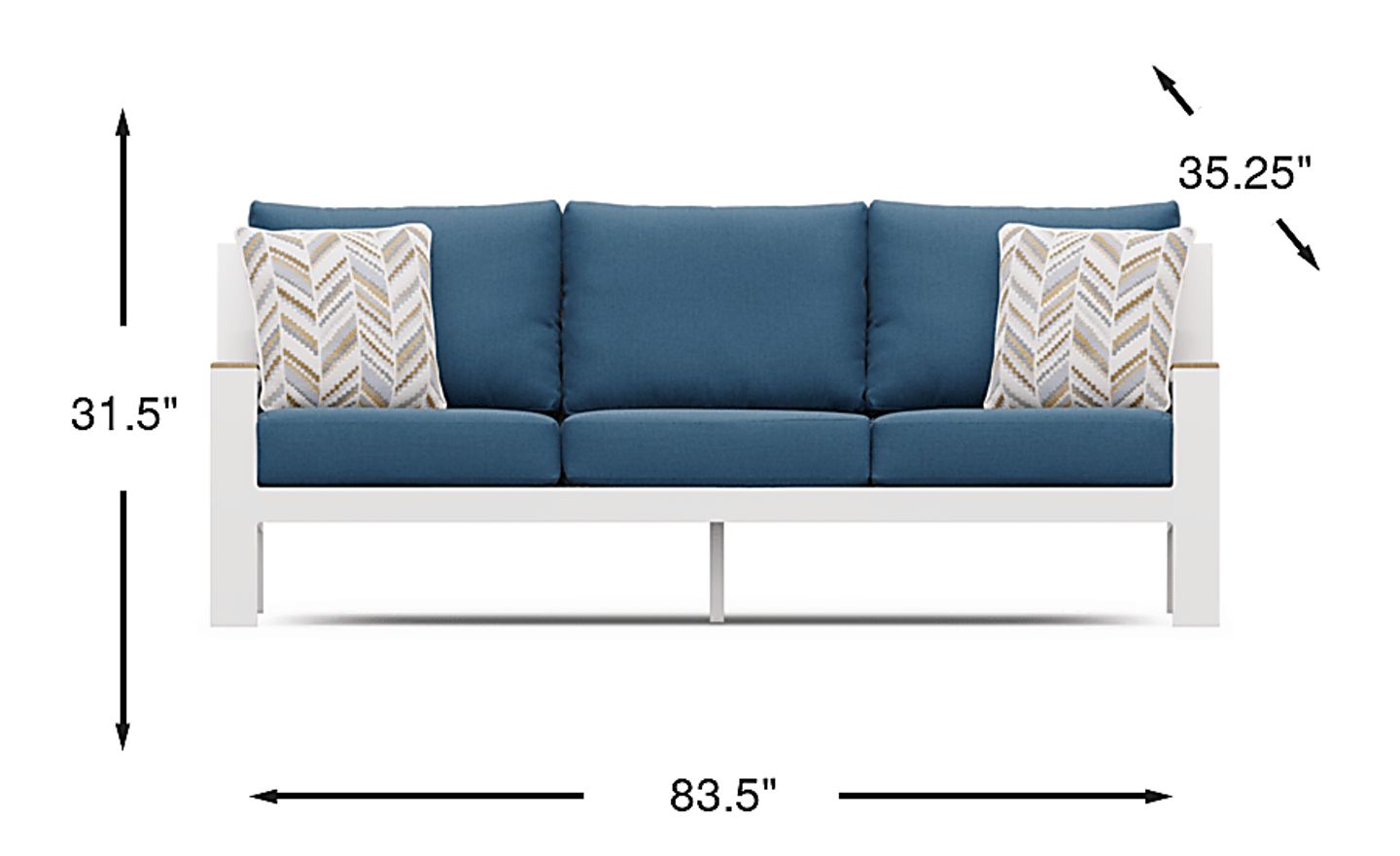 The Solana sofa embraces contemporary lines and an open, breezy slat back to make lounging on your patio an absolute treat. Made with a rust-resistant aluminum frame in a powder coated white finish with teak accents on both arms, each blueberry-colored cushion is solution dyed for durable outdoor use. Accent pillows in complementing tones are included, adding a subtle pop of color and texture that aids in your relaxation. High performance acrylic fabric. Select cushion colors also available in Sunbrella fabric.