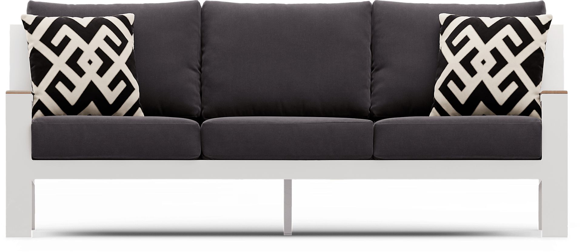 The Solana sofa embraces contemporary lines and an open, breezy slat back to make lounging on your patio an absolute treat. Made with a rust-resistant aluminum frame in a powder coated white finish with teak accents on both arms, each charcoal-colored cushion is solution dyed for durable outdoor use. Accent pillows in complementing tones are included, adding a subtle pop of color and texture that aids in your relaxation. High performance acrylic fabric. Select cushion colors also available in Sunbrella fabric.