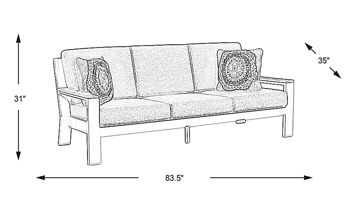 The Solana sofa embraces contemporary lines and an open, breezy slat back to make lounging on your patio an absolute treat. Made with a rust-resistant aluminum frame in a powder coated white finish with teak accents on both arms, each gray colored cushion is solution dyed for durable outdoor use. Accent pillows in complementing tones are included, adding a subtle pop of color and texture that aids in your relaxation. High performance acrylic fabric.
