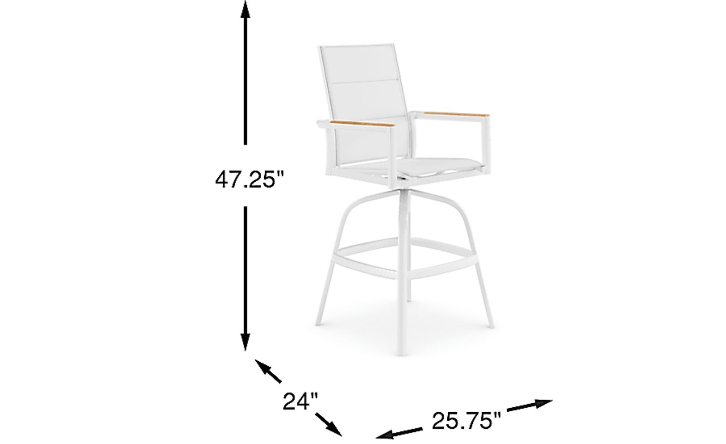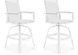 The Solana swivel barstool offers comfortable durability for any outdoor space. Made with a rust-resistant sturdy aluminum frame in a powder coated white finish, the padded vinyl seat features Dacron padding for streamlined comfort. Easily spot cleaned with mild soap and water, the lightweight frame makes it easy to reposition while each arm is embellished with teak wood accents.