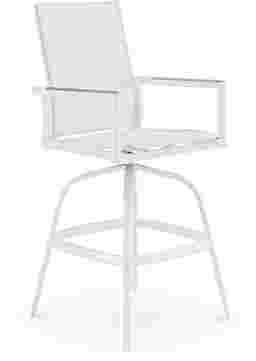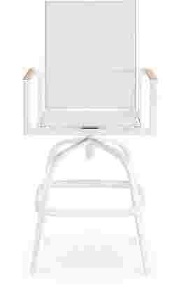 The Solana swivel barstool offers comfortable durability for any outdoor space. Made with a rust-resistant sturdy aluminum frame in a powder coated white finish, the padded vinyl seat features Dacron padding for streamlined comfort. Easily spot cleaned with mild soap and water, the lightweight frame makes it easy to reposition while each arm is embellished with teak wood accents.