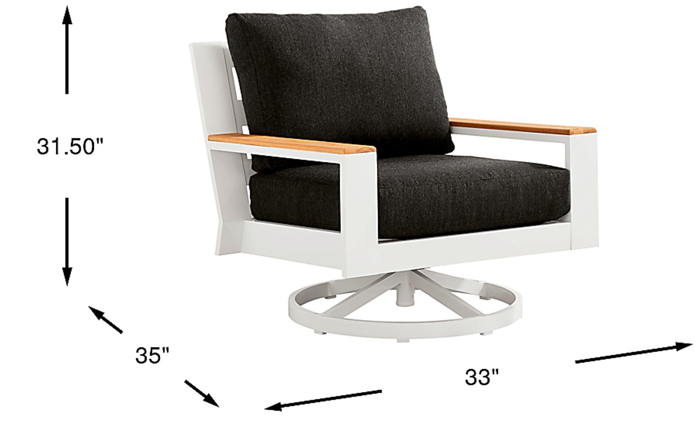 The Solana club chair has a casual look with clean, contemporary lines. Made with a rust-resistant aluminum frame in a powder coated white finish, teak accents on each arm add a hint of tropical flair. With upholstered cushions in a durable charcoal-colored solution dyed fabric for outdoor use, the open slat back creates a breezy look suitable for any outdoor space. A swivel base adds soothing motion for an ideal final touch. Select cushion colors also available in Sunbrella fabric.
