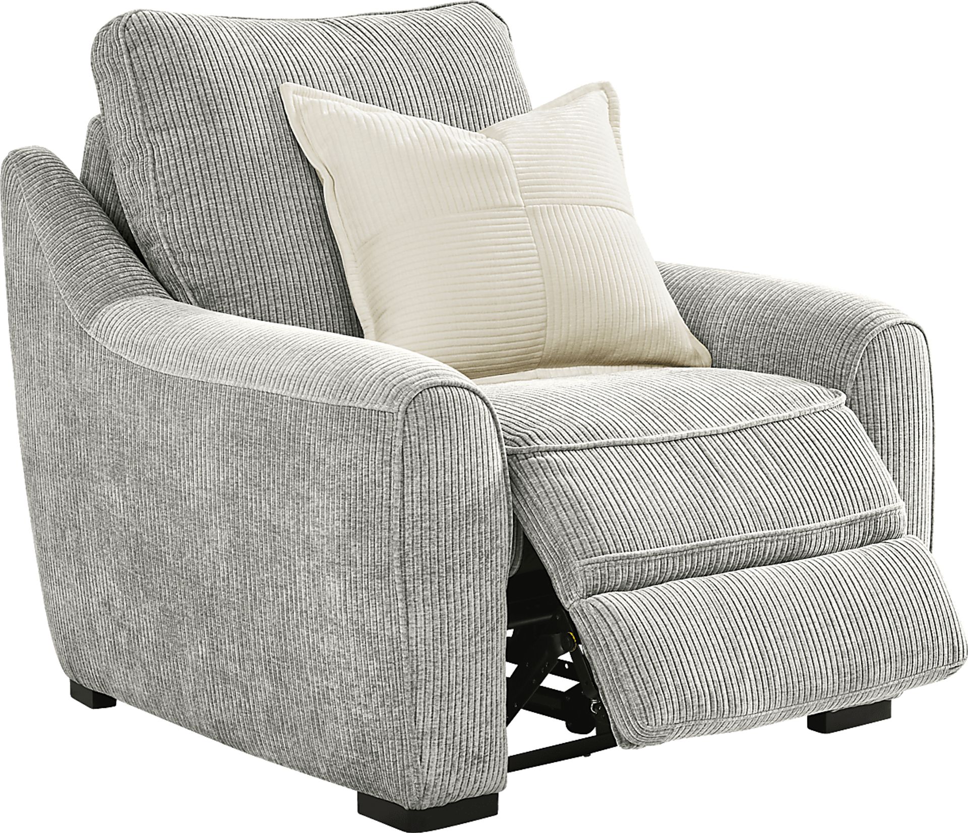 Like a fierce runway walk right into a warm and welcoming hug, the Somerset recliner from Cindy Crawford home makes head-turning style a fashionable, family affair. This contemporary seat showcases soft chenille cord upholstery in soothing gray. Tight welted seams hug each curve, from the charming, rounded track arms to the loose back cushion. The dual power reclining seat includes a power adjustable headrest and footrest with hidden control switches for a uniform look. Beneath the surface, the seat features a luxuriously soft fiber fill for a down-like texture. Upholstery: 100% Polyester.