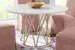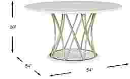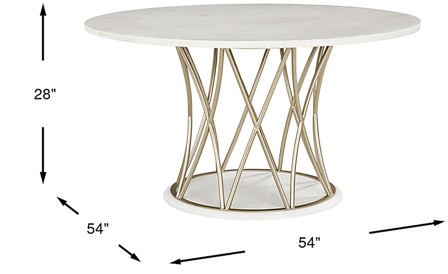 Strong, structured geometry softens into organic grace and poise to create the captivating look of the Soraya Street dining table. This round table features an interconnected metal pedestal base finished in a gold color, with a dazzling diamond pattern between its curved struts. A circular white marble tabletop and foot further elevate the stunning design.