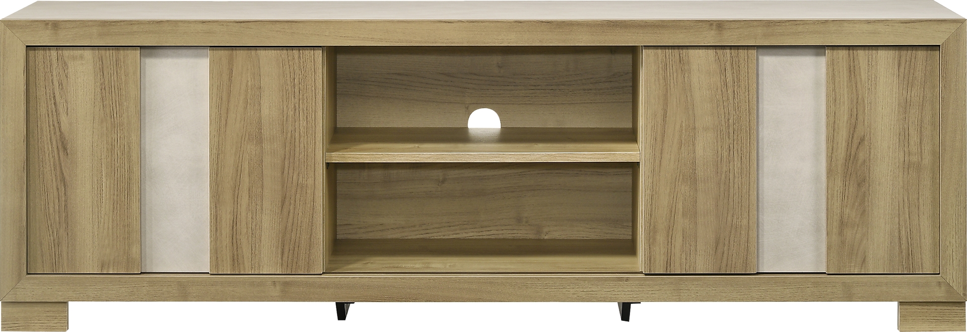 Capturing nature's quiet beauty elevated and refined, the Soundview collection brings natural charm with its rich textures and grounded tones. This contemporary console features a natural brown finish that highlights a wood-like grain, adding an organic touch to your space. Two sliding doors with ivory inlay panels reveal two spacious shelves for organized storage, while the center open shelves include wire management holes for a clutter-free setup. To complete the look, square block legs provide a sturdy foundation and a touch of modern simplicity.