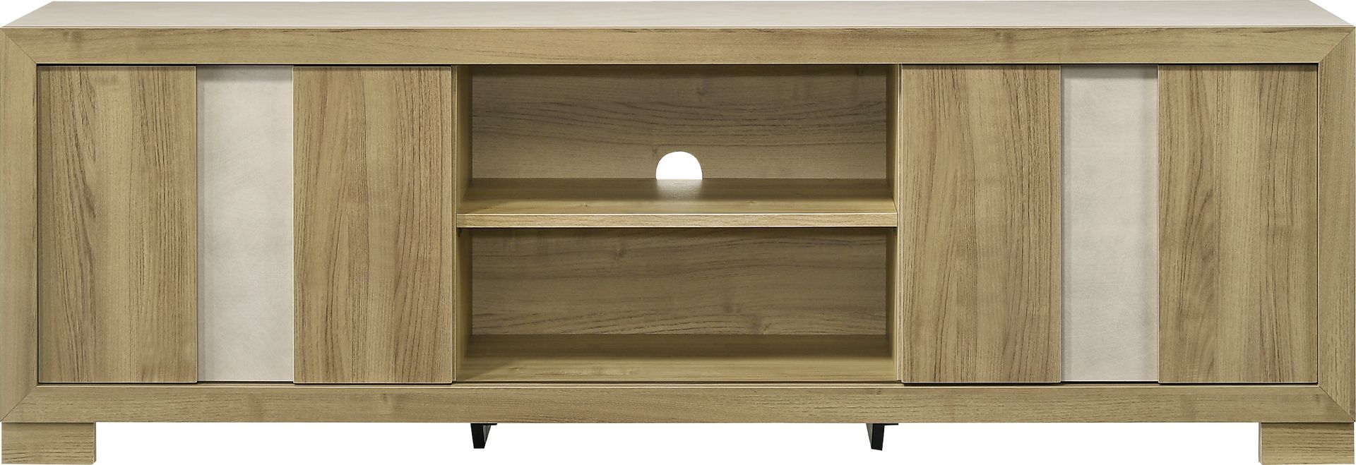 Capturing nature's quiet beauty elevated and refined, the Soundview collection brings natural charm with its rich textures and grounded tones. This contemporary console features a natural brown finish that highlights a wood-like grain, adding an organic touch to your space. Two sliding doors with ivory inlay panels reveal two spacious shelves for organized storage, while the center open shelves include wire management holes for a clutter-free setup. To complete the look, square block legs provide a sturdy foundation and a touch of modern simplicity.