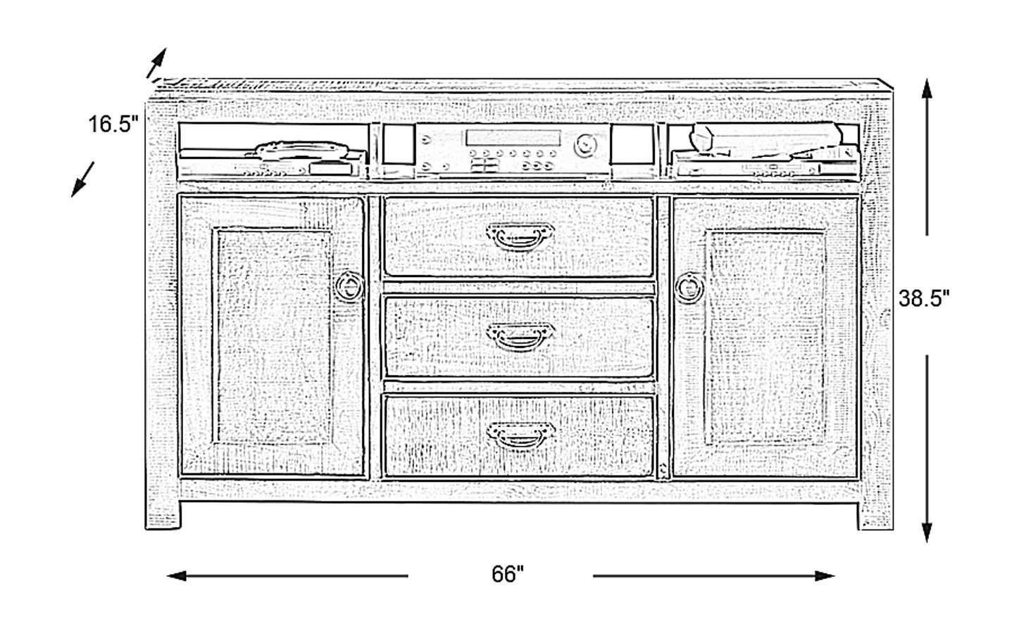 The South Creek console is the perfect headquarters for all your media needs. It is 66" long and accommodates up to a 70" flat screen TV. Triple drawers, open shelves, access holes for wire management and an adjustable shelf behind each door provide generous media storage. Crafted with solid pine front mouldings and maple veneers, the consoles' relaxed rustic style is enhanced by a beautiful blue finish that is carefully hand-applied, distressed, glazed and highlighted to capture the natural characteristics of pine. Antique bronze finished hardware adds the final touch.