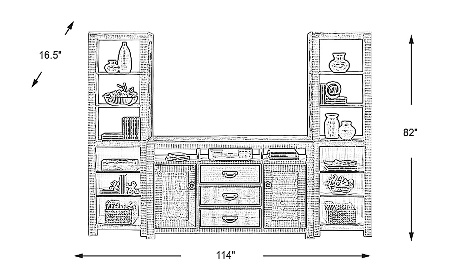 The South Creek wall unit is the perfect headquarters for all your media needs. The center console is 66" long and accommodates up to a 70" flat screen TV. Triple drawers, open shelves, access holes for wire management and an adjustable shelf behind each door provide generous media storage. Side piers with finished tops feature open shelves for display and decorative X-shaped wood designs on the sides. Crafted with solid pine front mouldings and maple veneers, the wall units' relaxed rustic style is enhanced by a beautiful antique white finish that is carefully hand-applied, distressed, glazed and highlighted to capture the natural characteristics of pine. Antique bronze finished hardware adds the final touch.