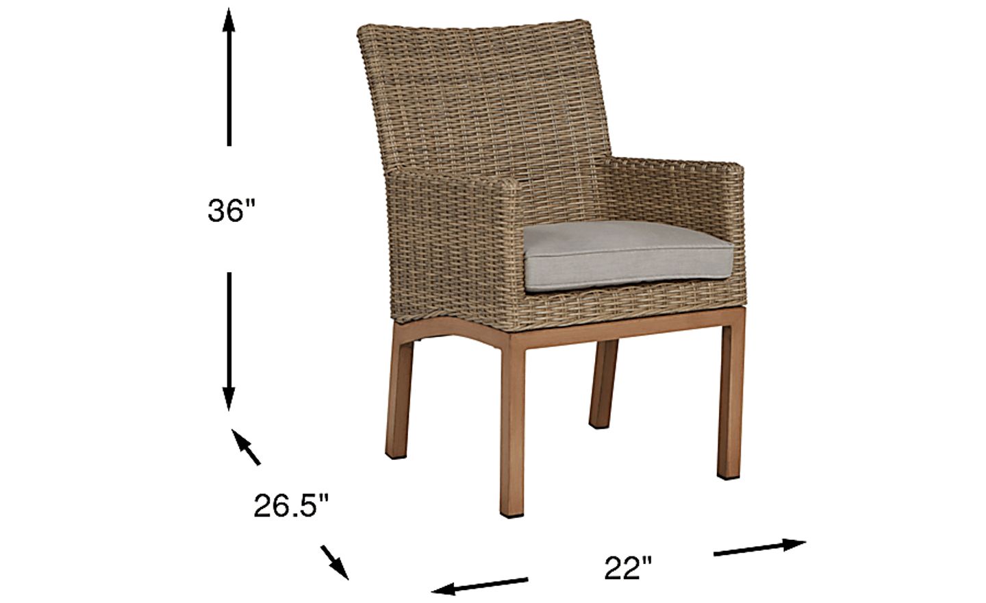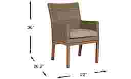 Ideal for outdoor dining the Southport arm chair offers relaxed styling and durable construction. The chair is made with tan colored all-weather wicker over a fully welded aluminum frame for rust resistance. The tie-back seat cushion provides comfort while strong aluminum legs have the look of wood with a tan finish.