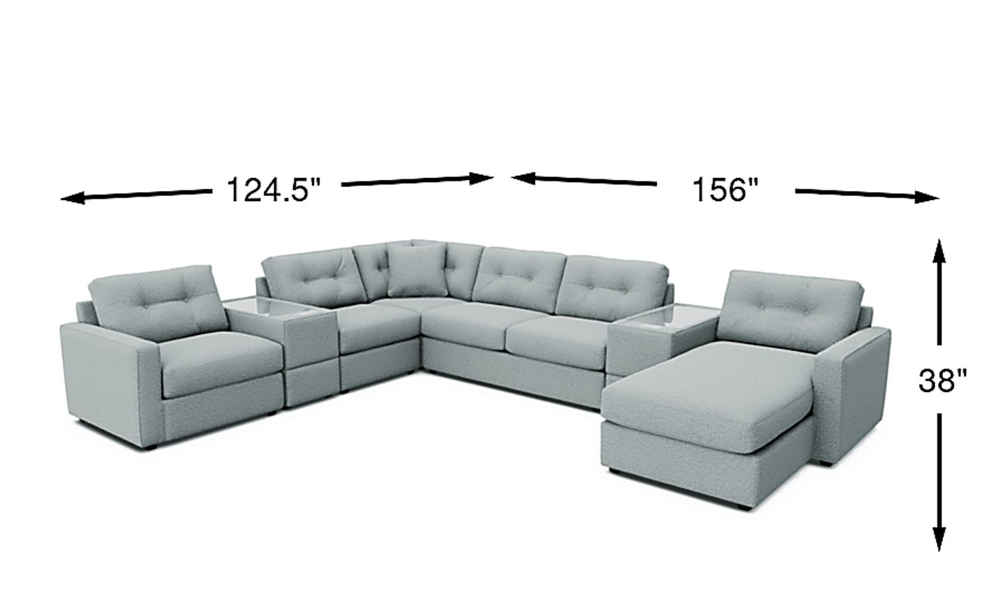 With a generous footprint of 156 inches by 124.5 inches, this sectional is specifically designed to anchor large spaces like open-concept "great rooms" or finished basements. Its modular nature allows you to scale the seating to fill a large area effectively, while the integrated media consoles with wireless charging and Bluetooth speakers turn the sectional into a self-contained entertainment hub, perfect for modern, multi-functional homes.