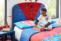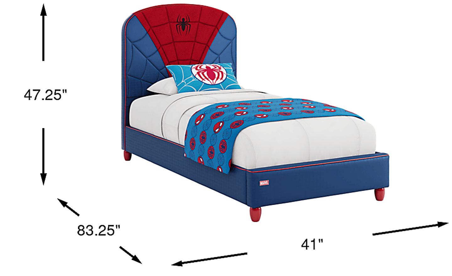 When your bedtime senses are tingling, imagine a world where the MARVEL SPIDER-MAN collection swings in to save the day! The focal point of this piece is the headboard's webtastic appearance that mimics our titular comic hero's iconic look. Achieved using a combination of smooth blue fabric and textured red mesh, the upholstery is detailed with tactile webbing that looks like the pattern on your favorite webslinger's suit. Finished with the Spidey emblem front and center, what's a super look without super features? This bed features simple grow-with-me-style adjustments designed to address the developmental needs of children. The wraparound frame sits lower to the ground on base glides but comes with a second set of taller wood legs, painted red, that raise the bed's height. Red piping tracing the upholstered frame helps tie the look together while the Marvel nameplate lets you know this is officially licensed merch. Mattress and foundation (if required) sold separately.