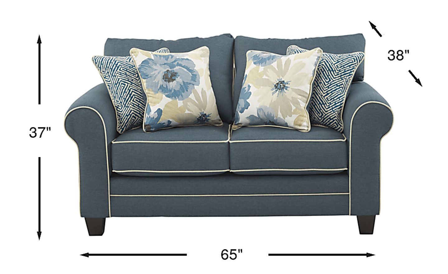Cozy and charming, the Spring Blooms loveseat is just the place to spend a lazy afternoon. Featuring plush roll arms, this lovely seat is covered in blue woven fabric, given a tailored appearance by contrasting cream welt detail. Included accent pillows showcasing contemporary geometric and oversized floral prints liven up this little loveseat, while sleek tapered wood legs contribute a clean, design element. Back and seat cushions are reversible. 100% Polypropylene