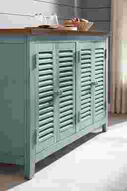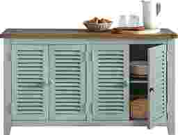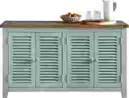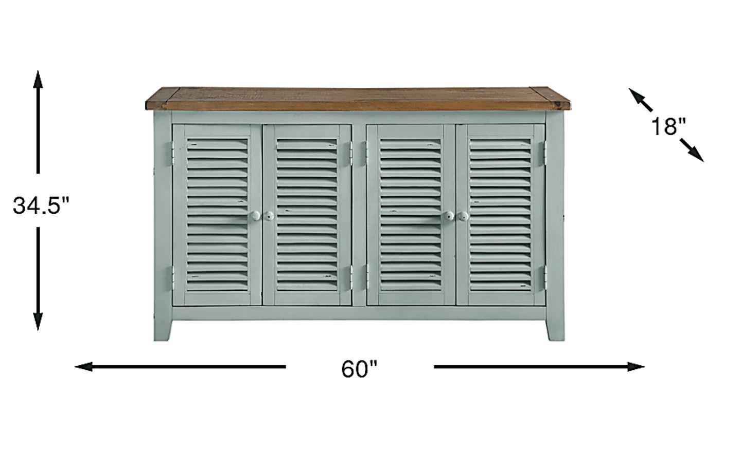 Spruce up your dining area with the farmhouse-inspired Spring Cottage server. Crafted with pine veneers, it boasts a two-tone look with a fresh blue finish and contrasting brown top. Shutter-style doors with round knobs give this piece a charming look. Plus, a shelf behind each set of doors makes for easy, organized storage.