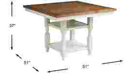 The Spring Cottage counter height table is ideal for everyday gatherings. The 51-inch square table, crafted with pine veneers, has a warm, brown-finished top that complements the rest of the table's white color. Twin slatted shelves offer a handy place for storage or display.