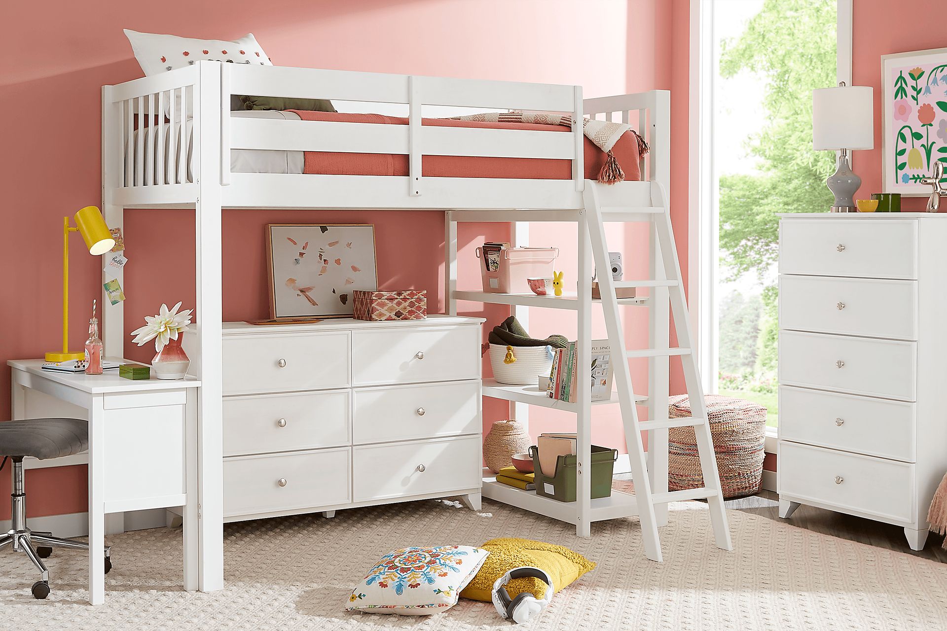 Whether they're a gaming wiz or all about K-pop, the neat design and natural wood grain flair of the Springtown loft bed make it a versatile staple to fit any kid's bedroom. Crafted with wood solids in a translucent white wash finish, this twin loft will fit seamlessly with your child's style and decor. Stacked with the twin over a spacious under side, your child will love reaching the top with careful steps up the attached ladder. The desk attaches to the outside of the loft, while removable shelves slide and sit on wooden cleats on the adjacent side. Mattress and foundation (if required) sold separately.