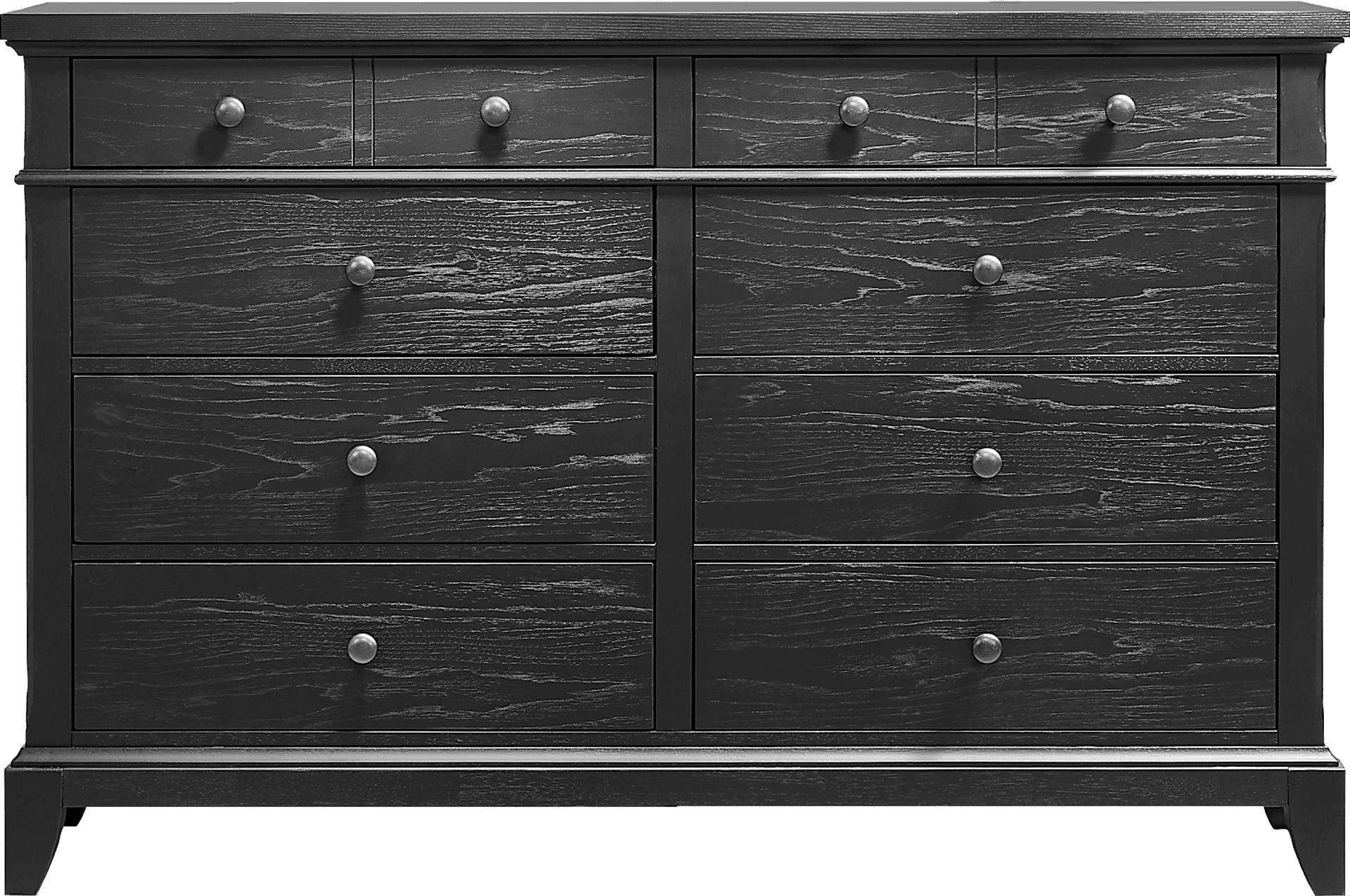 Settle gently into the timeless sanctuary of the Springville collection, embraced by the powerful calm waiting behind life's rush and noise. This handsomely detailed 8-drawer dresser showcases a soothing black finish and traditional style notes like tapered square legs and subtle chamfer details with decorative metal knobs in black.