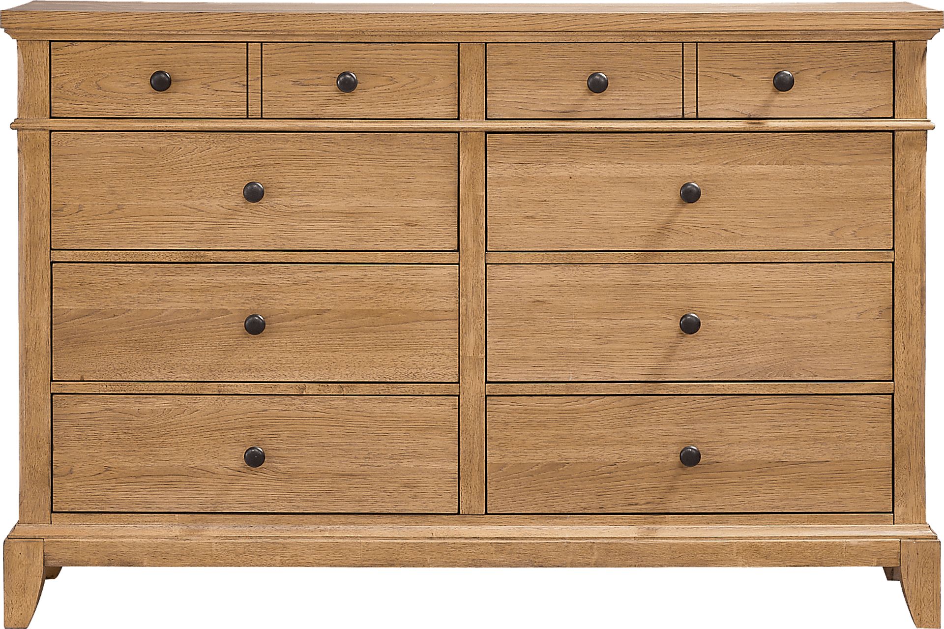 Settle gently into the timeless sanctuary of the Springville collection, embraced by the powerful calm waiting behind life's rush and noise. This handsomely detailed 8-drawer dresser showcases a soothing natural finish and traditional style notes like tapered square legs and subtle chamfer details with decorative metal knobs in black.