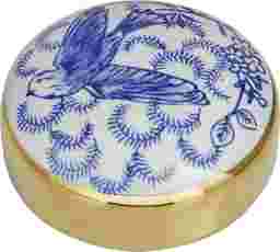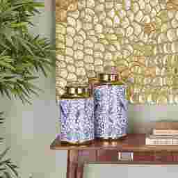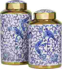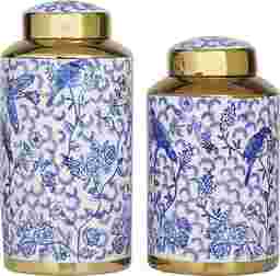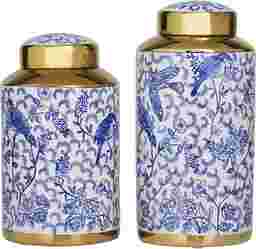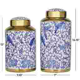 The Stalto Jar, Set of 2 is inspired by sleek elegance and clean lines, a minimalistic design offers effortless luxury with monochromatic tones and bold, angular structures. Crafted from enduring stoneware, this blue living room decorative jars set exudes sophistication in its design. Round decorative storage jar set features a glossy finish with intricate blue botanical and bird details on a white background, adorned by gold accents on the top and base. This stoneware set of 2 decorative jars features a deep body setting with wide mouth openings and removable round lids for easy storage. Each blue ceramic decorative jar measures 7L x 7W x 14.15H, 7.10L x 7.05W x 12H inches, and collectively weighs 6 lbs. Customer assembly is required.
