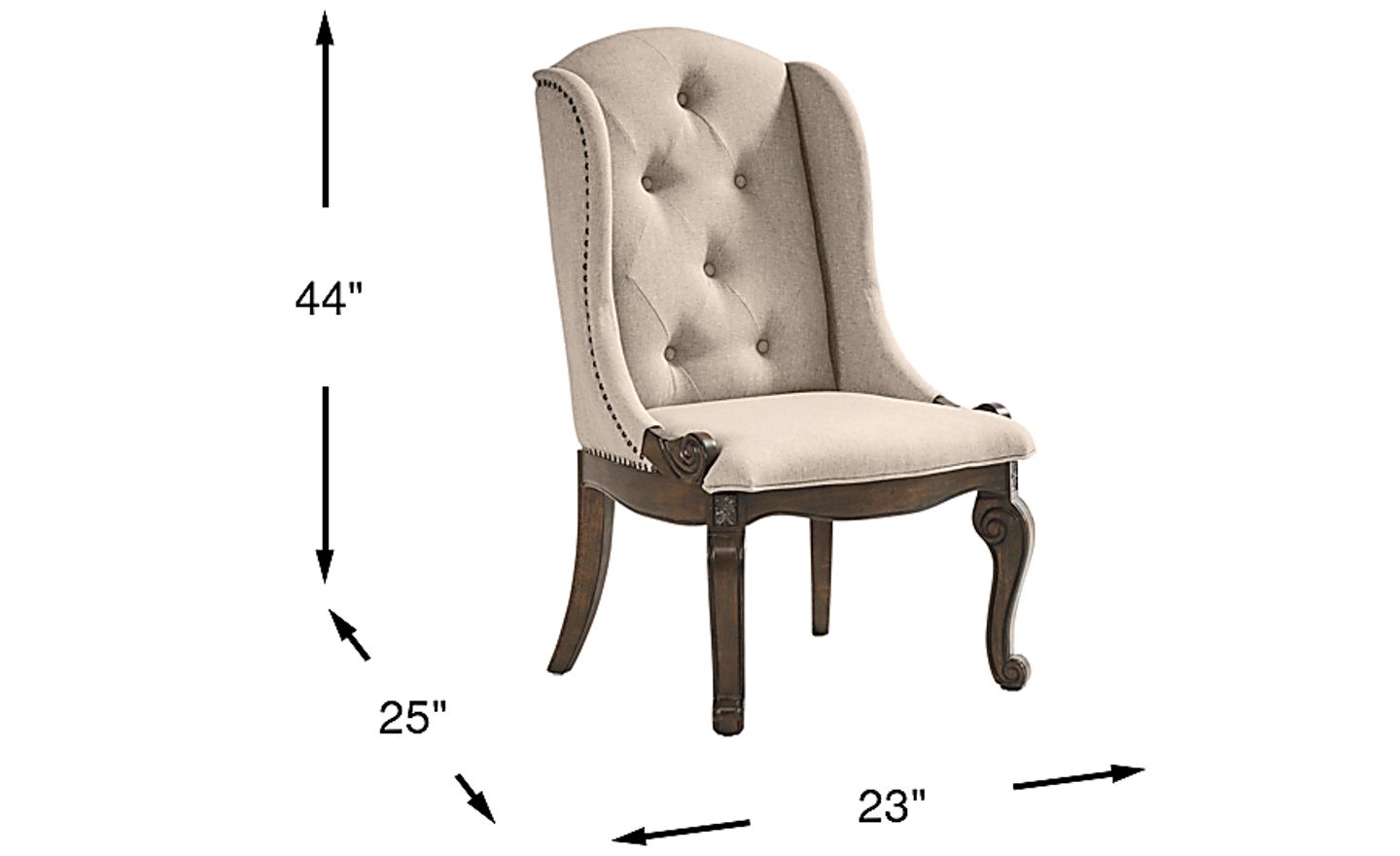 At 23 inches wide, this chair has a more substantial presence than a typical armless side chair. Its ornate rolled arms and tall 44-inch back make it a stunning statement piece best suited for formal dining rooms or as a "captain’s chair" at the head of a table. If used in a smaller apartment, its vertical height can draw the eye upward to create a sense of scale, but we recommend measuring to ensure you have enough clearance to pull the chair out comfortably from the table.