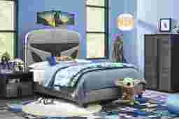 A STAR WARS™ bedroom without awesome furniture is like a Jedi without a Lightsaber™, the Millennium Falcon without hyperdrive or the Death Star without. well, you know. Sleek, lacquered black finish on the chest and nightstand play alongside carbonite melamine to complement the room's galactic aesthetic perfectly. The chest's drawers are made with concealed soft close drawer glides and feature oversized handles to pull. Organize books, decor and more with the nightstand's bookcase shelf OR utilize the bottom drawer's concealed storage option. Upholstered in a shimmering steel dark gray vinyl fabric, the focal point of this room is the grow-with-me bed that is crafted to resemble our titular hero. The wraparound frame sits low on base glides but comes with a second set of matching wood legs that raise the height. The reading light plugs into the USB-A port on the headboard, mimicking Mando's helmet. Mattress and foundation (if required) sold separately.