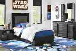 A STAR WARS™ bedroom without awesome furniture is like a Jedi without a Lightsaber™, the Millennium Falcon without hyperdrive or the Death Star without. well, you know. Incredible glow effects are produced by the remote touch, multi-color LED lights that surround the twin bed's two-tone headboard. Sleek, lacquered black finish on each piece plays alongside carbonite melamine to complement the galactic aesthetic perfectly. The dresser drawers are made with concealed soft close drawer glides and feature oversized vertical handle pulls. Providing the ultimate reflective surface for light and shadow to collide, the mirror's multi-tone LED light mimics the iconic ignition of a Lightsaber™ with the flip of its on/off switch. All pieces are plated with the Star Wars name, letting you know this is officially licensed merchandise. Mattress and foundation (if required) sold separately.