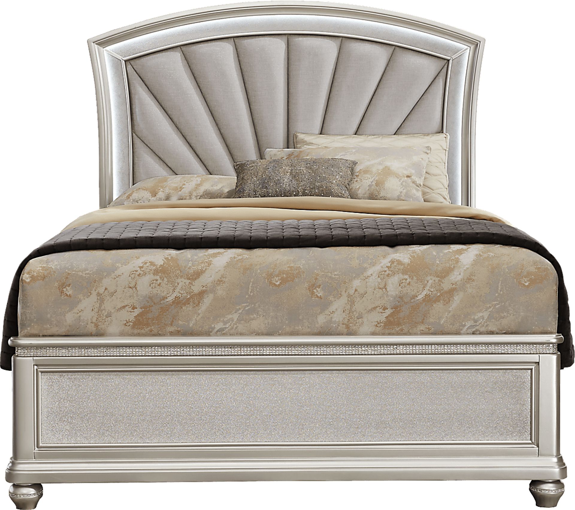 Capture the magic of Old Hollywood with the glamorous Starlet Lane bed. Showcasing a stunning silver finish, this king-sized bed features a headboard with a top arch that runs over gentle curving side edges. Offsetting the headboard's sparkling silver is a gray upholstery framed by an LED strip for plenty of light. Shimmering accenting and bun feet on the bed's panel footboard help set the scene for a good night's sleep. Mattress and foundation (if required) sold separately.