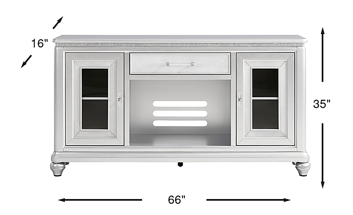 Capture the magic of Old Hollywood with the glamorous Starlet Lane collection's lustrous details and opulent hues. Contemporary in style, this console comes in a stunning silver finish with shimmering embellishments that exude star-worthy glamour. A center drawer with sparkling textured fronts provides hidden storage, while two outer doors with glass inlays offer the perfect space to showcase decorative accents. An open shelf with wire management holes ensures a clen, clutter-free setup for media devices. Clear acrylic pulls with silver metal accents and bun feet with bedazzled bands complete the look with a touch of sparkly sophistication.