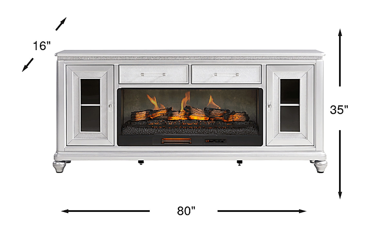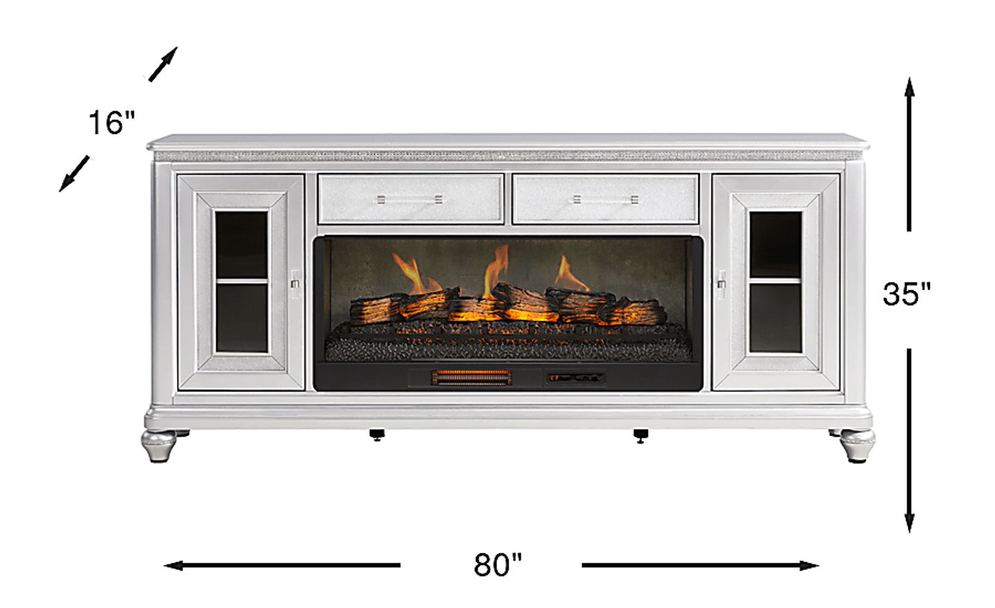 Capture the magic of Old Hollywood with the glamorous Starlet Lane collection's lustrous details and opulent hues. Contemporary in style, this console comes in a stunning silver finish with shimmering embellishments that exude star-worthy glamour. Two center drawers with sparkling textured fronts provide hidden storage, while two outer doors with glass inlays offer the perfect space to showcase decorative accents. The electric fireplace features innovative flame effects on bricks and logs for added depth and 3D realism, conveniently controlled by remote to adjust the flame and glow levels. Clear acrylic pulls with silver metal accents and bun feet with bedazzled bands complete the look with a touch of sparkly sophistication.